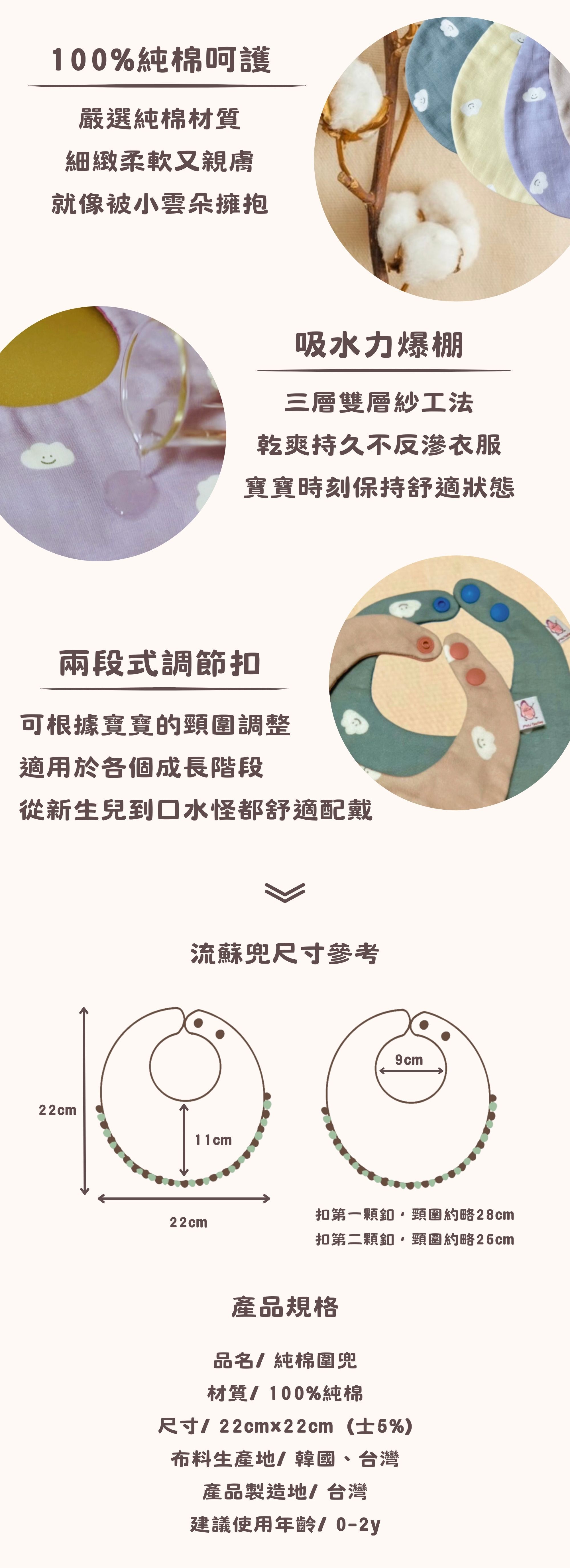 採用柔軟親膚布料製作,觸感細緻,貼合寶寶嬌嫩肌膚;雙釦設計可依寶寶成長調整尺寸,實用又貼心。